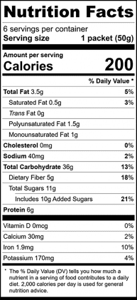 Certified Gluten Free Whole Grain Oats, Cane Sugar, Flax Meal, Dried Apples, Natural Flavors, Chia Seeds, Cinnamon, Quinoa, Amaranth, Sea Salt.