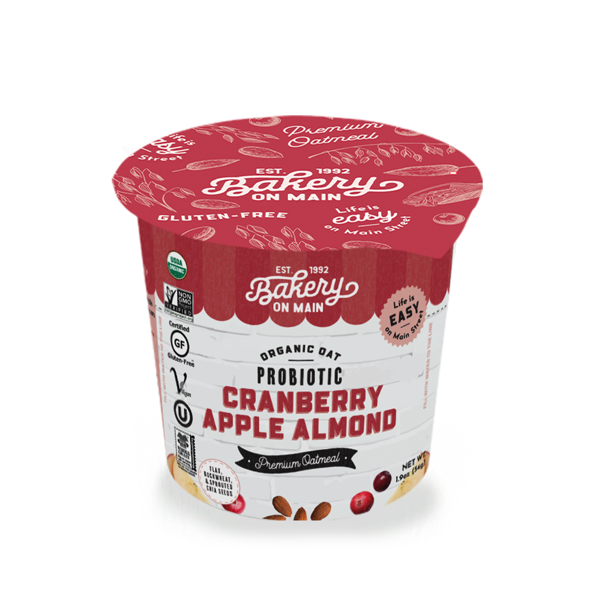 Organic Whole Grain Oats, Organic Cane Sugar, Organic Sweetened Dried Cranberries (Organic Cranberries, Organic Cane Sugar, Organic Sunflower Oil), Organic Dried Apples, Organic Almonds, Organic Flax Meal, Natural Flavors,Organic Buckwheat, Organic Sprouted Chia Seeds, Organic Cinnamon, Organic Cardamom, Organic Inulin, Bacillus coagulans GBI-306086. Contains: Almonds // Warning: May Contain Nutshell Fragments