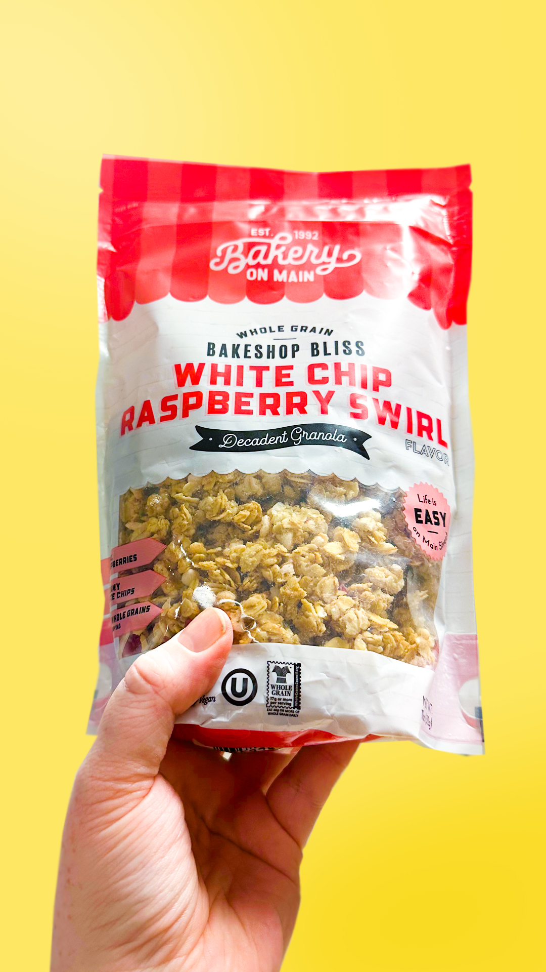 Whole Grain Oats, Canola Oil, Cane Sugar, Invert Syrup, Brown Rice Syrup, White Chips (Cane Sugar, Palm Oil, Natural Flavors, Sunflower Lecithin, Salt), Brown Rice, Dried Raspberries, Natural Flavors, Sea Salt, & Tocopherals(Vitamin E) .